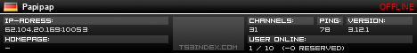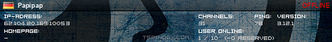 TS3index.com stellt Ihnen eine große Auswahl von verschiedenen Serverbannern bereit. Der Serverbanner zeigt den Status des TeamSpeak 3 Servers als Grafik im PNG-Format an. Kopieren Sie den Code in Ihre Website, Forum oder Blog.