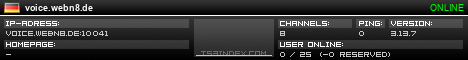 TS3index.com stellt Ihnen eine große Auswahl von verschiedenen Serverbannern bereit. Der Serverbanner zeigt den Status des TeamSpeak 3 Servers als Grafik im PNG-Format an. Kopieren Sie den Code in Ihre Website, Forum oder Blog.