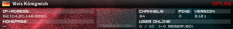 TS3index.com stellt Ihnen eine große Auswahl von verschiedenen Serverbannern bereit. Der Serverbanner zeigt den Status des TeamSpeak 3 Servers als Grafik im PNG-Format an. Kopieren Sie den Code in Ihre Website, Forum oder Blog.