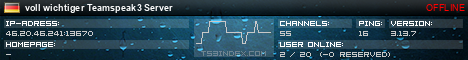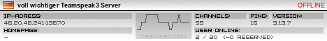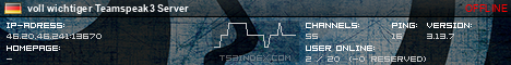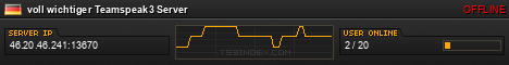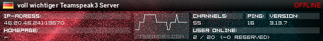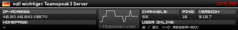 TS3index.com stellt Ihnen eine große Auswahl von verschiedenen Serverbannern bereit. Der Serverbanner zeigt den Status des TeamSpeak 3 Servers als Grafik im PNG-Format an. Kopieren Sie den Code in Ihre Website, Forum oder Blog.
