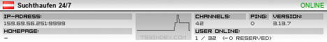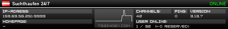 TS3index.com stellt Ihnen eine große Auswahl von verschiedenen Serverbannern bereit. Der Serverbanner zeigt den Status des TeamSpeak 3 Servers als Grafik im PNG-Format an. Kopieren Sie den Code in Ihre Website, Forum oder Blog.