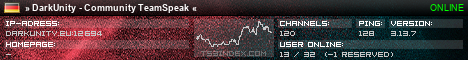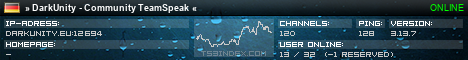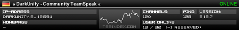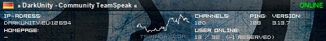 TS3index.com stellt Ihnen eine große Auswahl von verschiedenen Serverbannern bereit. Der Serverbanner zeigt den Status des TeamSpeak 3 Servers als Grafik im PNG-Format an. Kopieren Sie den Code in Ihre Website, Forum oder Blog.