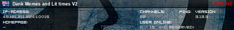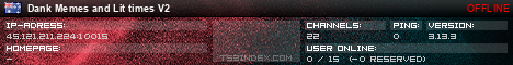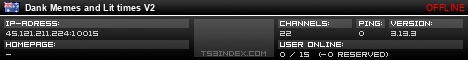 TS3index.com stellt Ihnen eine große Auswahl von verschiedenen Serverbannern bereit. Der Serverbanner zeigt den Status des TeamSpeak 3 Servers als Grafik im PNG-Format an. Kopieren Sie den Code in Ihre Website, Forum oder Blog.