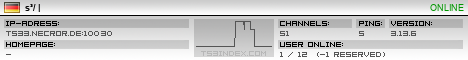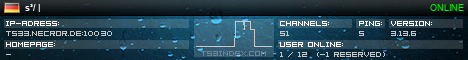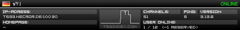 TS3index.com stellt Ihnen eine große Auswahl von verschiedenen Serverbannern bereit. Der Serverbanner zeigt den Status des TeamSpeak 3 Servers als Grafik im PNG-Format an. Kopieren Sie den Code in Ihre Website, Forum oder Blog.
