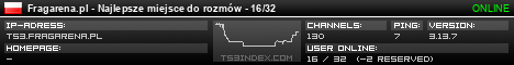 TS3index.com stellt Ihnen eine große Auswahl von verschiedenen Serverbannern bereit. Der Serverbanner zeigt den Status des TeamSpeak 3 Servers als Grafik im PNG-Format an. Kopieren Sie den Code in Ihre Website, Forum oder Blog.