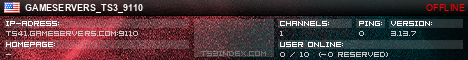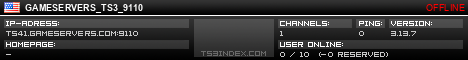 TS3index.com stellt Ihnen eine große Auswahl von verschiedenen Serverbannern bereit. Der Serverbanner zeigt den Status des TeamSpeak 3 Servers als Grafik im PNG-Format an. Kopieren Sie den Code in Ihre Website, Forum oder Blog.