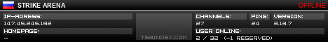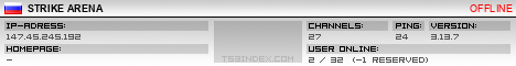 TS3index.com stellt Ihnen eine große Auswahl von verschiedenen Serverbannern bereit. Der Serverbanner zeigt den Status des TeamSpeak 3 Servers als Grafik im PNG-Format an. Kopieren Sie den Code in Ihre Website, Forum oder Blog.