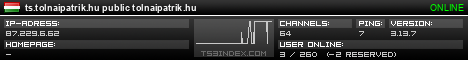TS3index.com stellt Ihnen eine große Auswahl von verschiedenen Serverbannern bereit. Der Serverbanner zeigt den Status des TeamSpeak 3 Servers als Grafik im PNG-Format an. Kopieren Sie den Code in Ihre Website, Forum oder Blog.