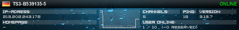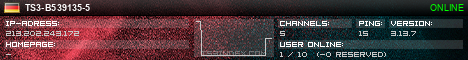 TS3index.com stellt Ihnen eine große Auswahl von verschiedenen Serverbannern bereit. Der Serverbanner zeigt den Status des TeamSpeak 3 Servers als Grafik im PNG-Format an. Kopieren Sie den Code in Ihre Website, Forum oder Blog.