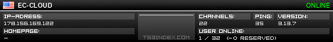 TS3index.com stellt Ihnen eine große Auswahl von verschiedenen Serverbannern bereit. Der Serverbanner zeigt den Status des TeamSpeak 3 Servers als Grafik im PNG-Format an. Kopieren Sie den Code in Ihre Website, Forum oder Blog.