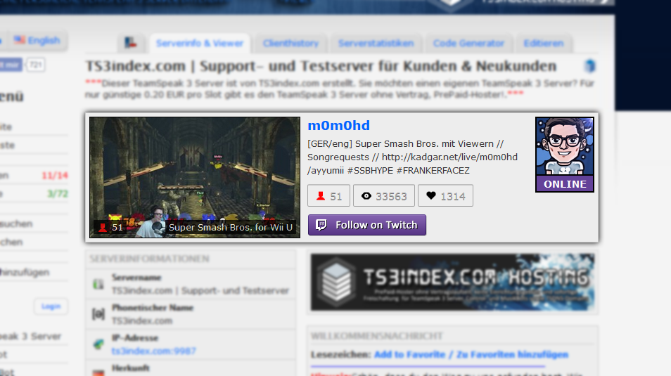 2. LIVE-Status für Twitch und HitBox! In den Einstellungen unter Netzwerke kann der Let's Player sein Twitch und HitBox-Kanal angeben. Der Status wird auf dem Index des TeamSpeak 3 Servers angezeigt, wenn der Streamer ONLINE ist