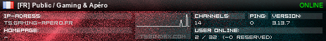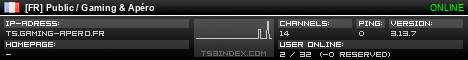 TS3index.com stellt Ihnen eine große Auswahl von verschiedenen Serverbannern bereit. Der Serverbanner zeigt den Status des TeamSpeak 3 Servers als Grafik im PNG-Format an. Kopieren Sie den Code in Ihre Website, Forum oder Blog.
