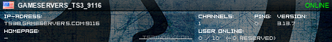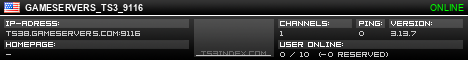 TS3index.com stellt Ihnen eine große Auswahl von verschiedenen Serverbannern bereit. Der Serverbanner zeigt den Status des TeamSpeak 3 Servers als Grafik im PNG-Format an. Kopieren Sie den Code in Ihre Website, Forum oder Blog.