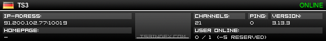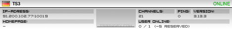 TS3index.com stellt Ihnen eine große Auswahl von verschiedenen Serverbannern bereit. Der Serverbanner zeigt den Status des TeamSpeak 3 Servers als Grafik im PNG-Format an. Kopieren Sie den Code in Ihre Website, Forum oder Blog.