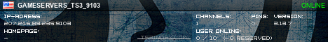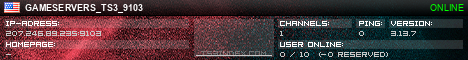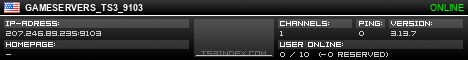 TS3index.com stellt Ihnen eine große Auswahl von verschiedenen Serverbannern bereit. Der Serverbanner zeigt den Status des TeamSpeak 3 Servers als Grafik im PNG-Format an. Kopieren Sie den Code in Ihre Website, Forum oder Blog.