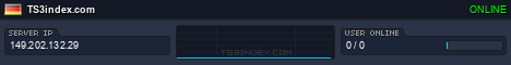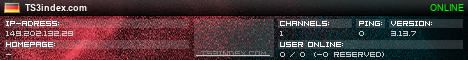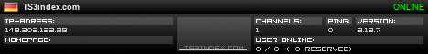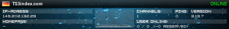 TS3index.com stellt Ihnen eine große Auswahl von verschiedenen Serverbannern bereit. Der Serverbanner zeigt den Status des TeamSpeak 3 Servers als Grafik im PNG-Format an. Kopieren Sie den Code in Ihre Website, Forum oder Blog.